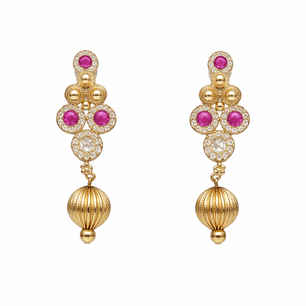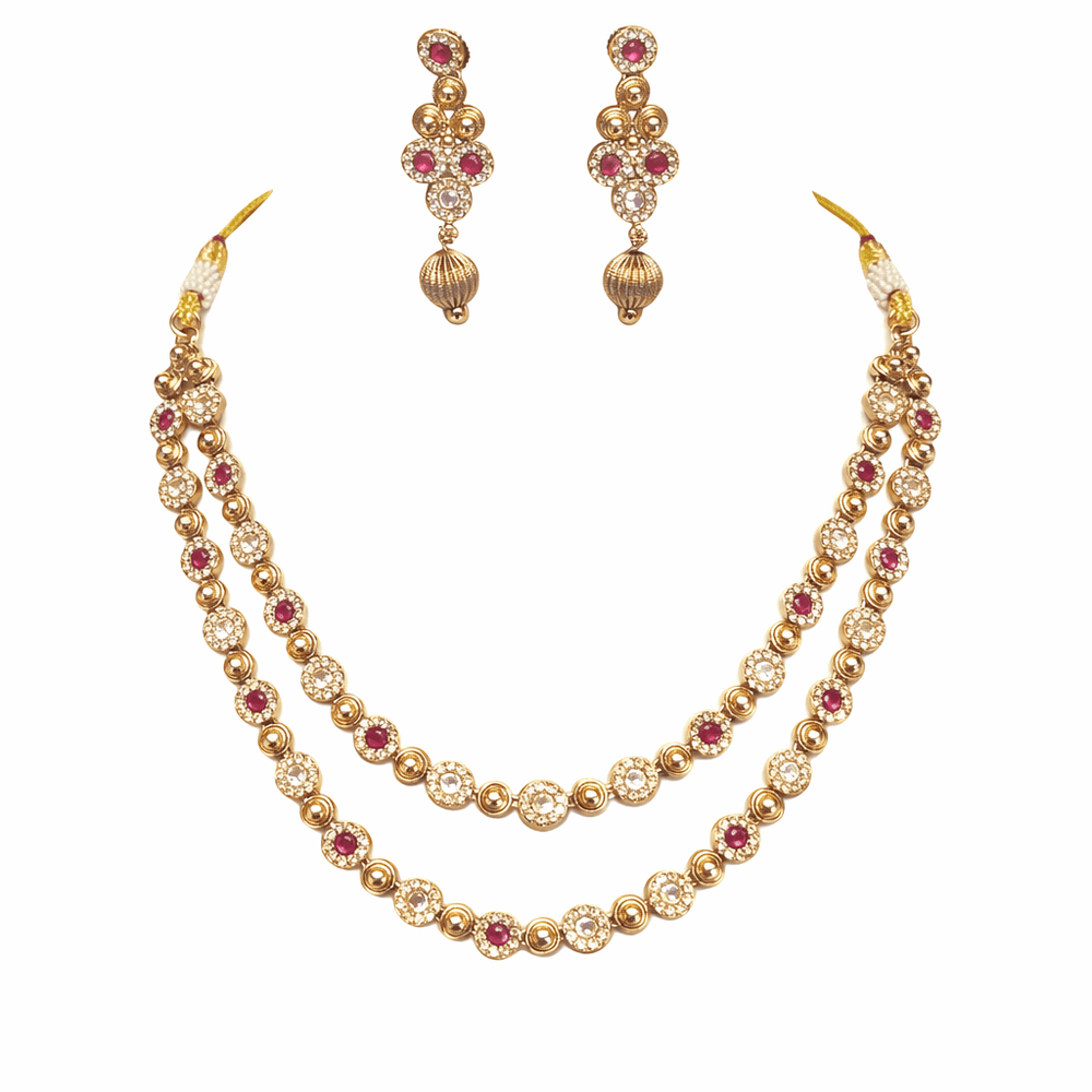 Add timeless elegance to your ethnic wardrobe with this beautifully crafted Gold Plated Double Layer Kundan Necklace Set, designed to bring a royal touch to every special occasion. Featuring intricately set ruby-colored stones and sparkling Kundan work, this necklace set reflects the richness of traditional Indian jewellery.