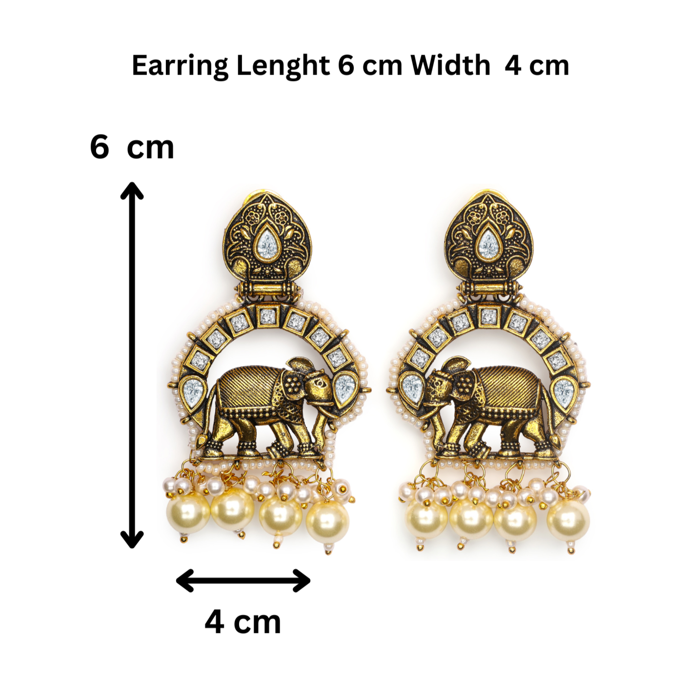 Antique-finish dangle earrings showcasing intricately carved royal elephant (haathi) motifs .Embellished with kundan-style square and teardrop stones for a heritage appeal.