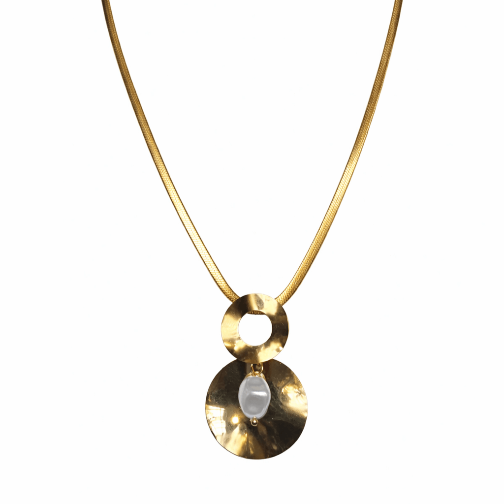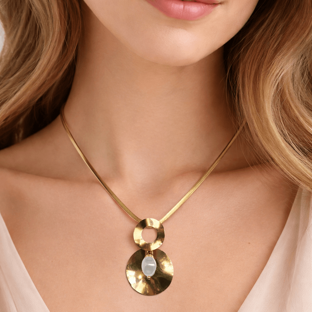 Elegant Double Disc Pendant Design ? Two layered gold discs create a modern, statement look