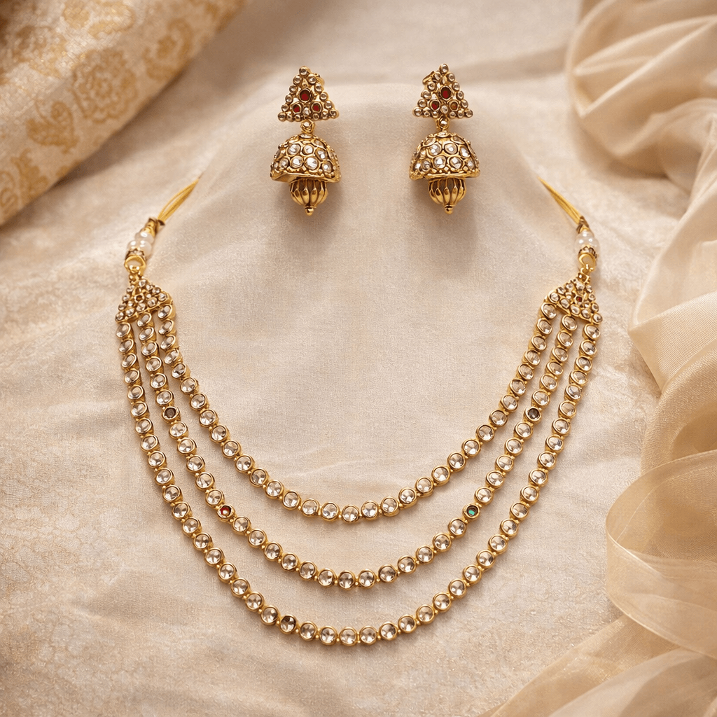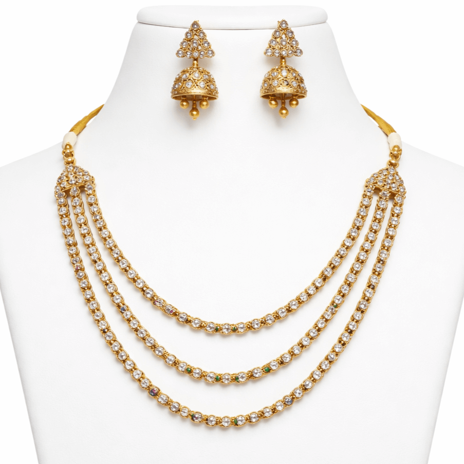 Gold Plated Multi-Layer Triple Line CZ Stone Kundan Necklace Set for Women