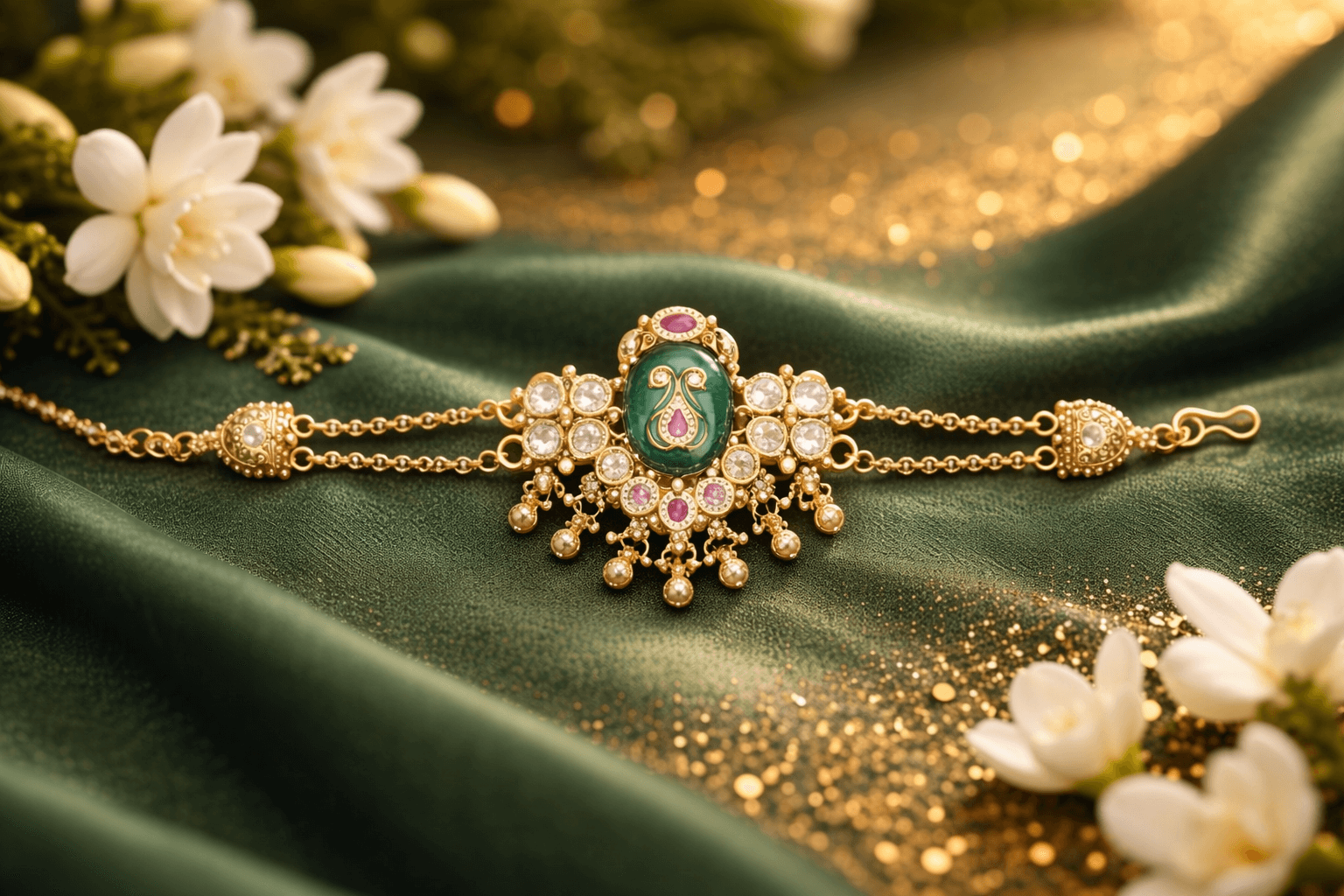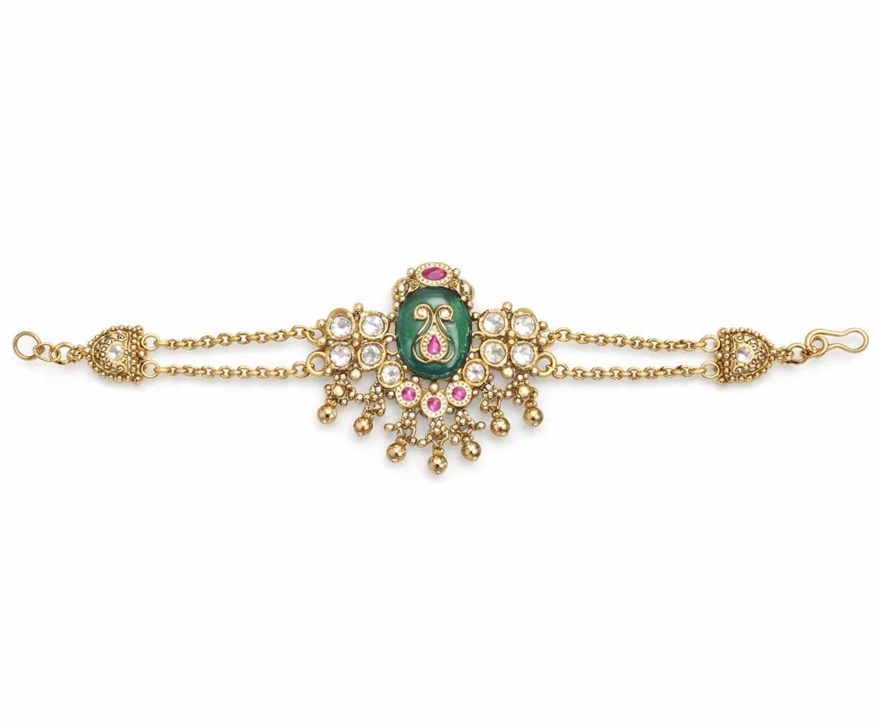 Delicate dangling gold beads add movement and charm, making this bracelet a perfect statement accessory for weddings, festivals, and cultural celebrations. The adjustable chain with secure hook closure ensures a comfortable fit for most wrist sizes, combining style with ease of wear.