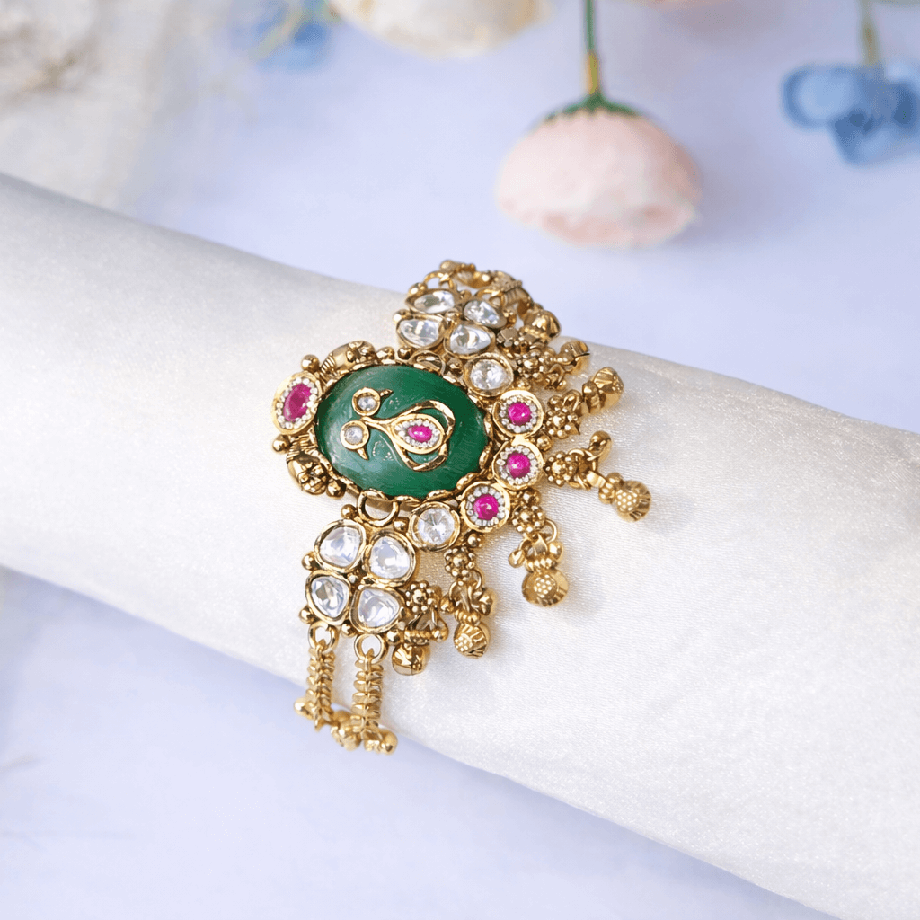 Enhance your ethnic look with this traditional antique gold-plated Kundan bracelet for women, beautifully crafted to reflect timeless Indian artistry. The bracelet features a stunning green meenakari center motif, intricately designed and surrounded by sparkling white Kundan stones with elegant pink stone accents, creating a royal and graceful appearance.