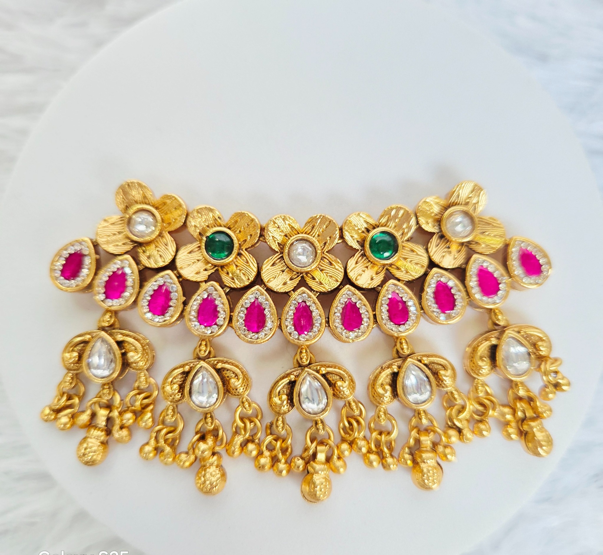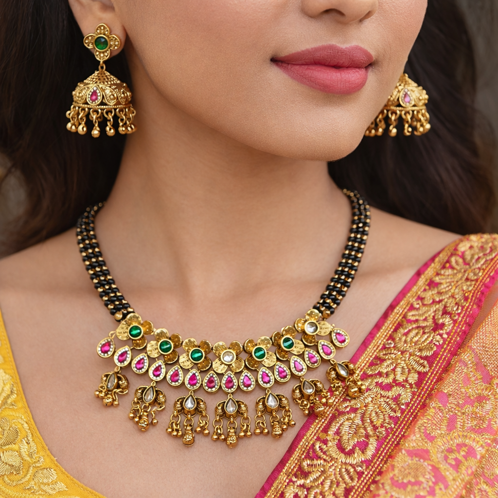 Antique Gold-tone with pink, green, and white Kundan stone accents
