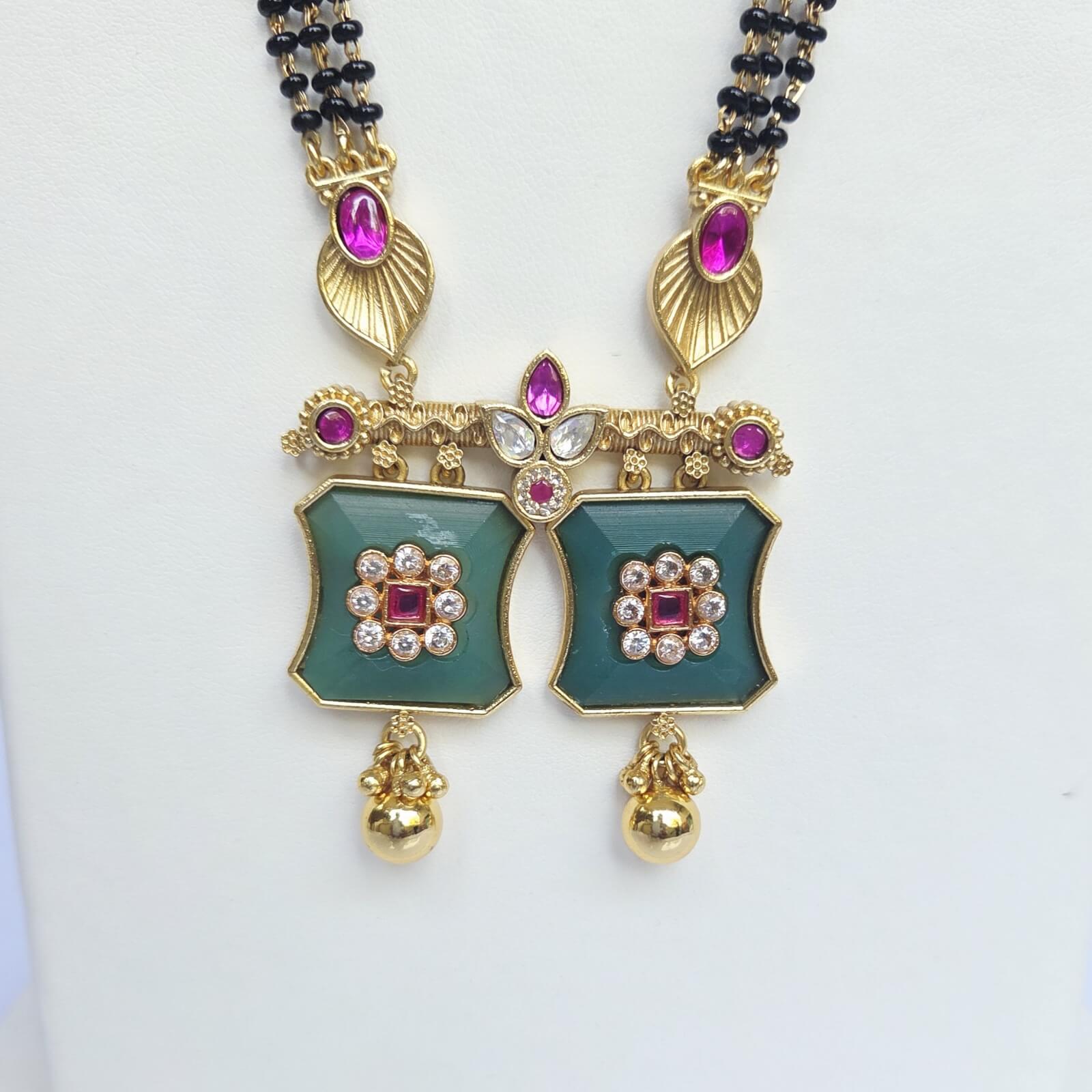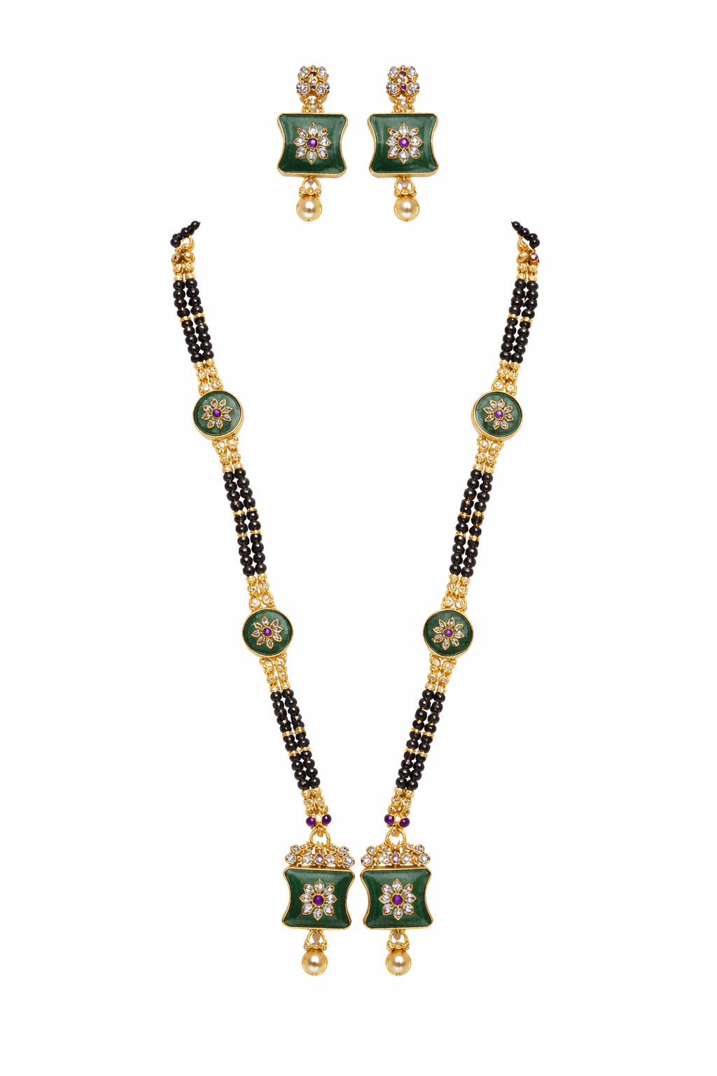 Traditional Green Enamel Gold Plated Square Pendant Long Mangalsutra