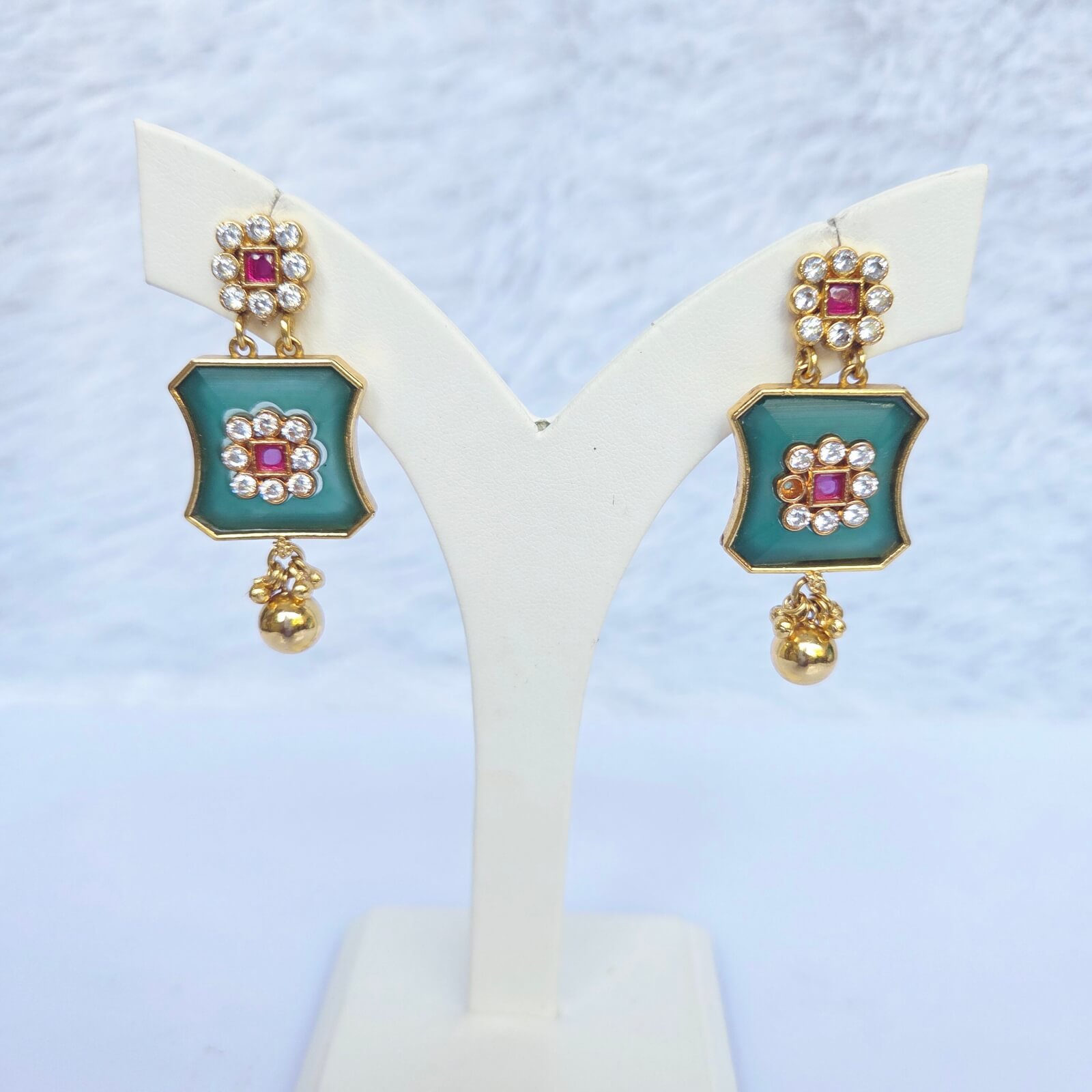 The highlight of this set is the green enamel square-shaped pendant, beautifully embellished with sparkling white stones and subtle pink stone accents. A delicate pearl drop adds charm and sophistication to the design. The matching earrings mirror the pendant style, completing the set with a graceful and balanced look.