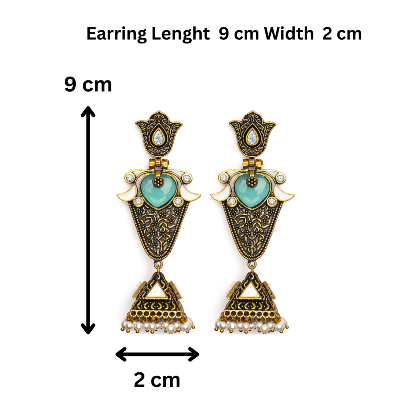 This ornate earrings with a Mehandi gold-colored base and turquoise accents,The earrings feature a layered design with a teardrop-shaped main body, triangular Jhumka at the bottom.