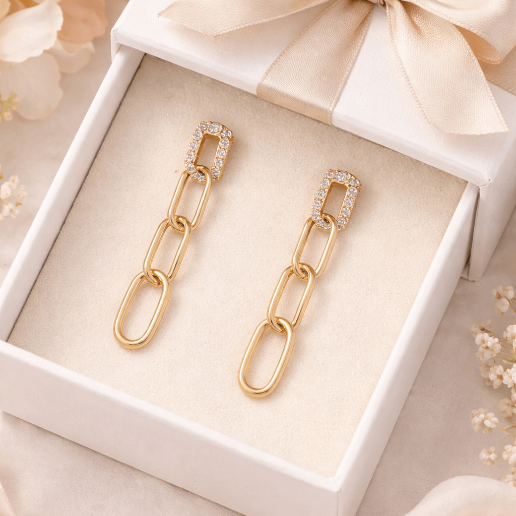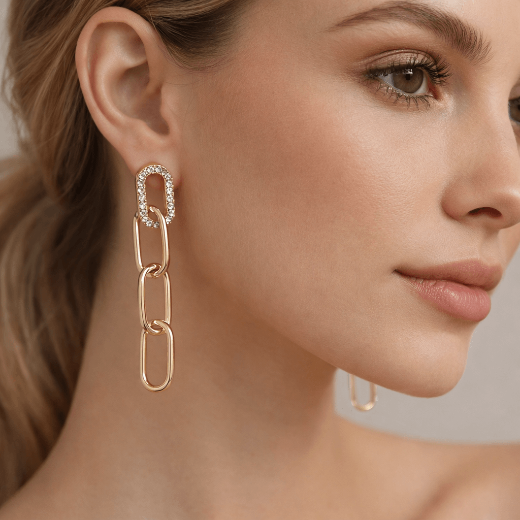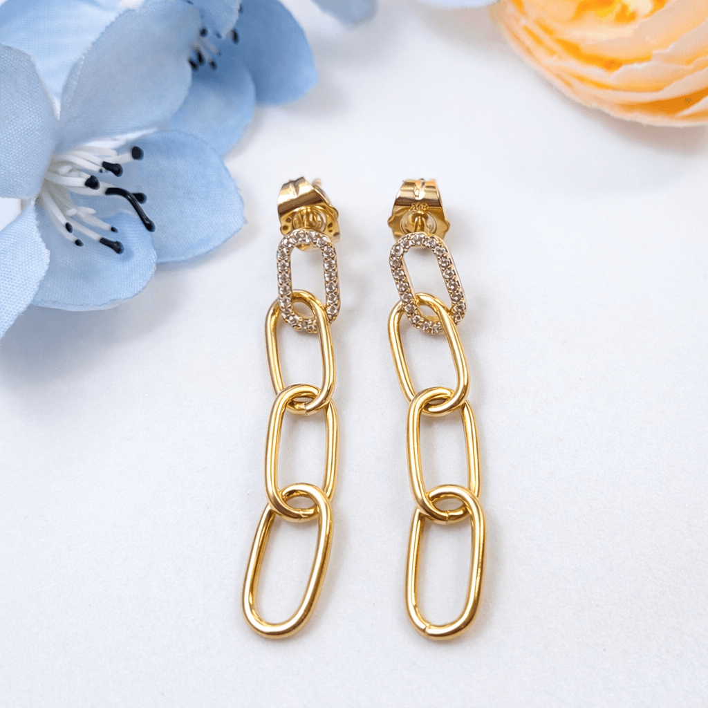 Trendy Gold-Tone Chain Link Drop Earrings with Crystal Studs